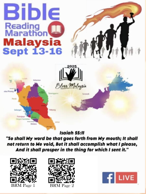 日期:13-16.9.2025 下周六上午10点开始,脸书上将有一场圣经朗读马拉松。鼓励弟兄姐妹一起和朗读的弟兄姐妹宣读神的话语。 可以扫码这两个二维码即可进入页面